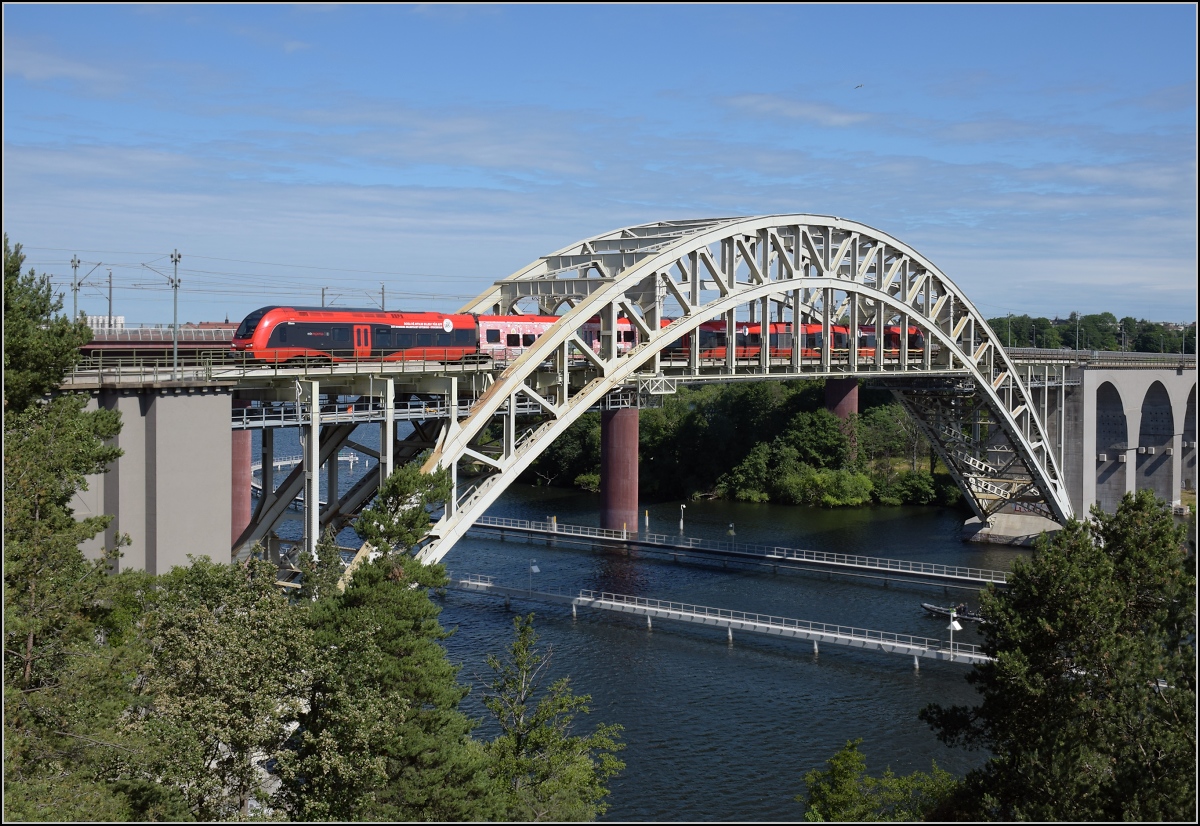 X74 005 'Glenn' der MTR auf der Årstabrücke. Das anhebbare Segment erscheint wie ein Tor zum Stockholmer Stadtteil Södermalm. Årstaberg, Juni 2018.