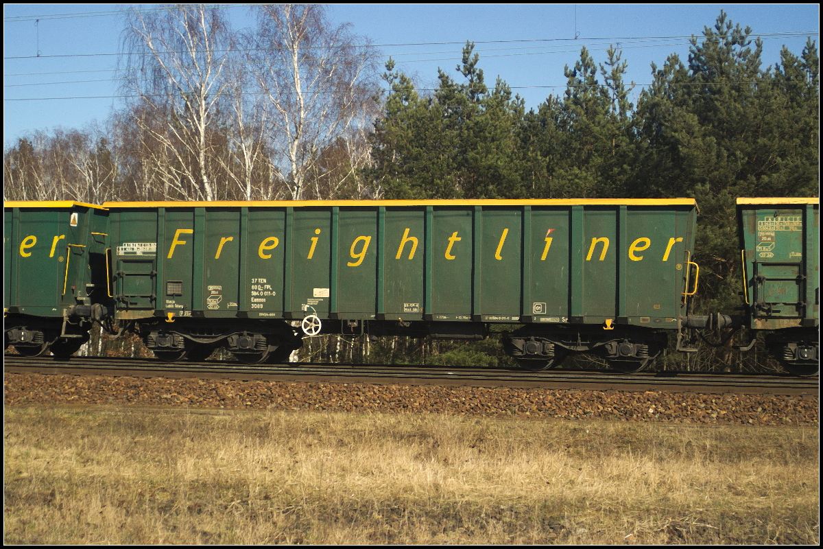 Vierachsiger offener Güterwagen der Gattung Eamnoss 11 des Unternehmens Frightliner PL. Der Wagen war in einem Zug mit Split eingereiht, der am 06.04.2018 durch die Berliner Wuhlheide fuhr (31 RIV 51 PL-FPL 5841 235-5 Eamnoss 11).