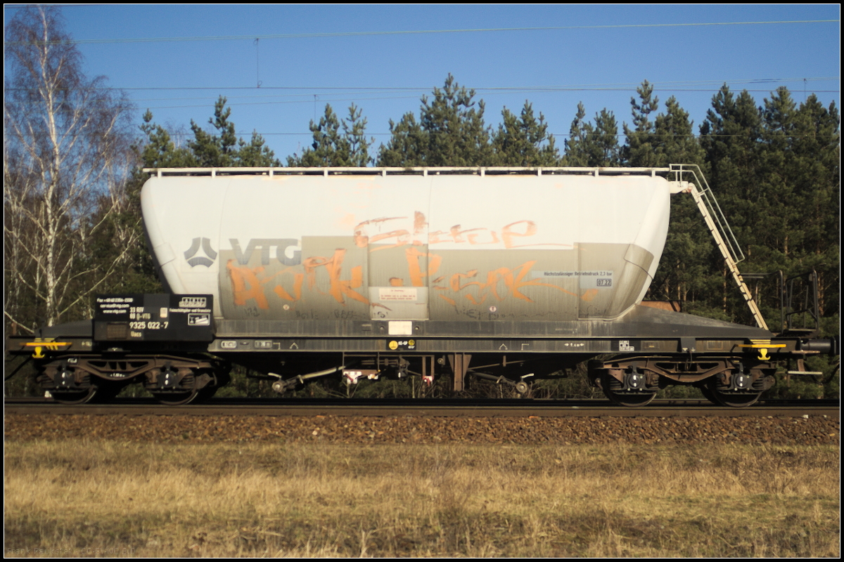 Vierachsiger Drehgestell-Staubgutwagen der Gattung Uacs des Einstellers VTG Hamburg. Eingereiht war der Wagen in einem Zug weiterer Wagen, der am 06.04.2018 durch die Berliner Wuhlheide fuhr (83 RIV 80 D-VTG 9325 022-7 Uacs).