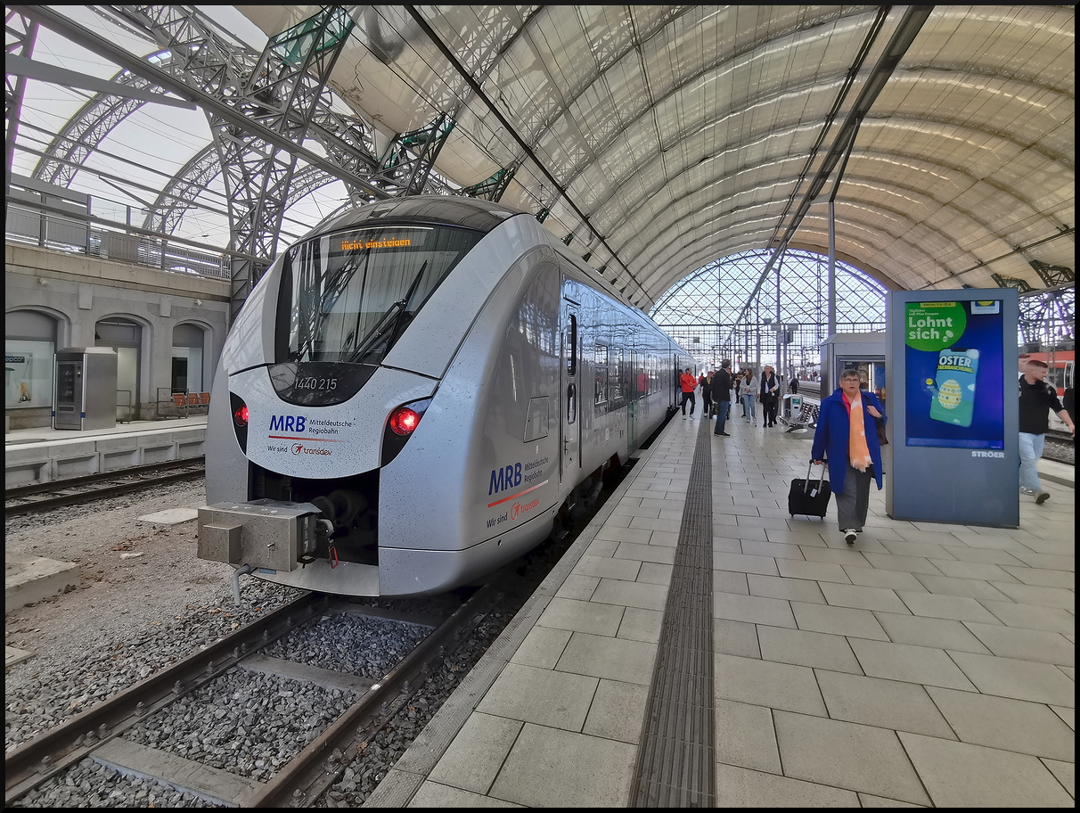MRB 1440 215, durch das Frontdesign auch 'Grinsekatze' genannt, kam auf Gleis 6 zum Endhalt in den Dresdner Hauptbahnhof um dann als RE3 nach Hof Hbf zu fahren. Beim Kopfmachen am 12.04.2025 entstand das Bild NVR-Nummer: 94 80 1440 215-0 D-BOBy)