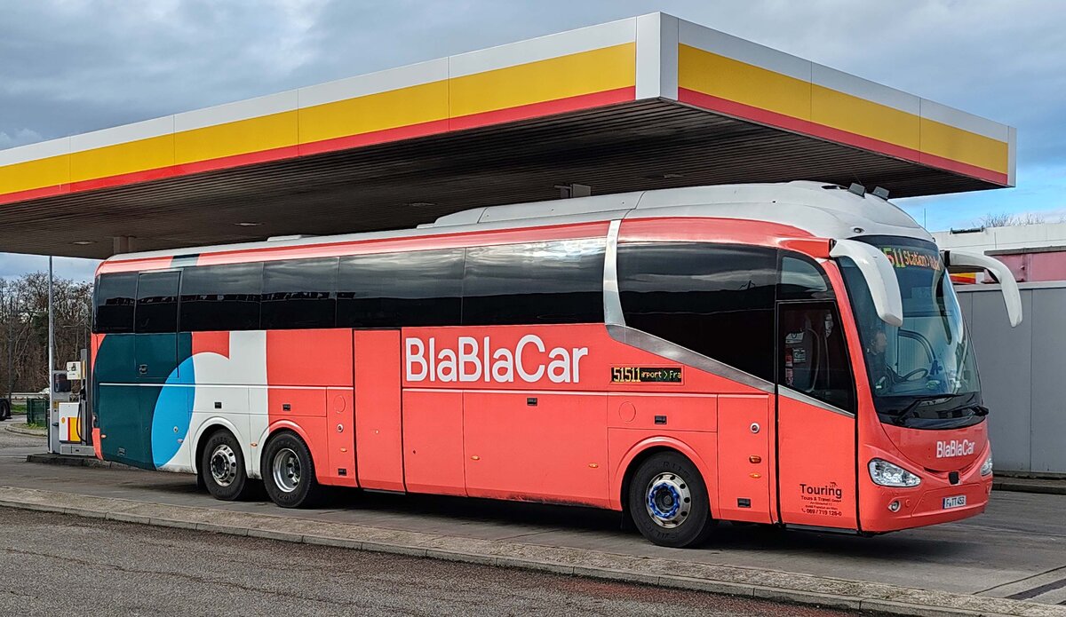 Scania Irizar vom BlaBlaCar-Touring aus Frankfurt steht an einer Tankstelle an der A5, 01-2025