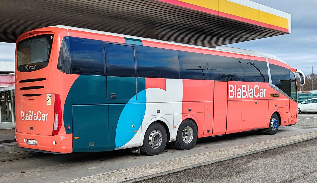 Scania Irizar vom BlaBlaCar-Touring aus Frankfurt steht an einer Tankstelle an der A5, 01-2025