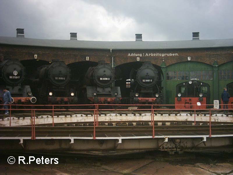 50 3706, 50 3695 und 52 8284 im Ringlokschuppen des BW Staßfurt. September 2005