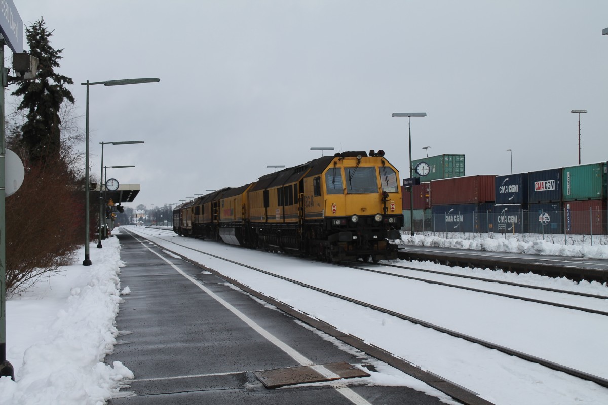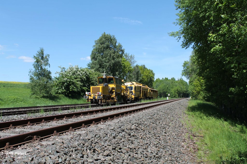 Im Block hinter der Regionalbahn rollt eine Stopfmaschine+ Schotterbesen bei Retzbach-Zellingen hinterher 21.10.24