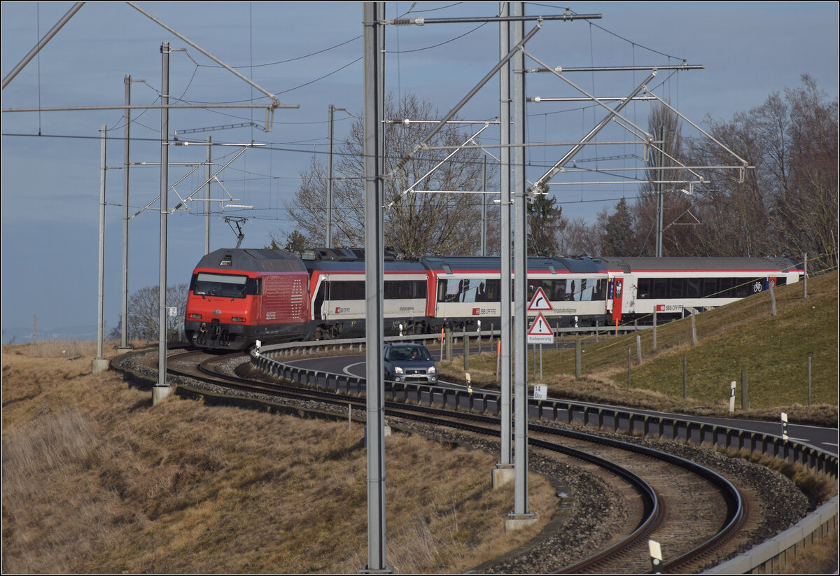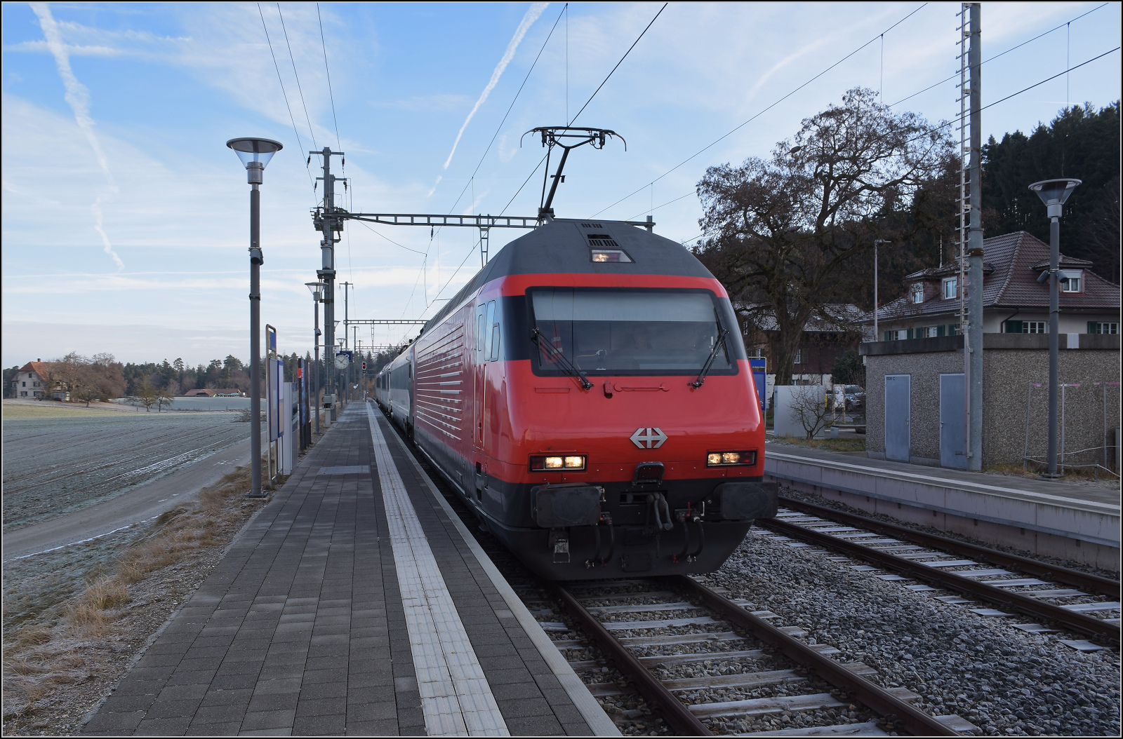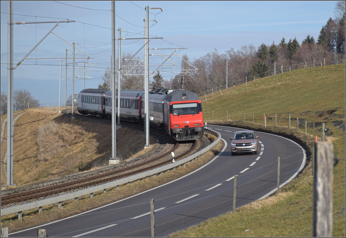 Deutschlands schnellster Klimaschützer zum Fahrgastinformationssystemtest auf Abwegen. Und prompt vom konsequentesten Klimaschützer überholt. Der hintere Triebkopf 401 555-8 vom ICE 1 Rosenheim und Re 460 000-3 Grauholz unter der Bodenseewelle in Konstanz. August 2020.