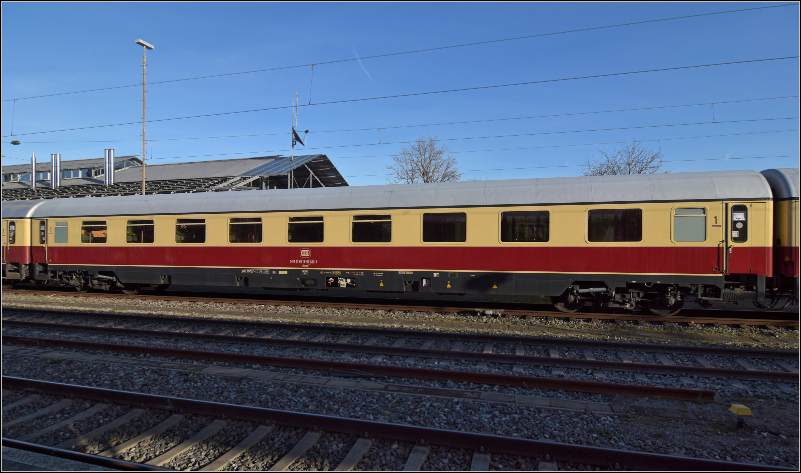 Wagen 4 ist ein Avmz 111.1, 61 80 19-90 134-6. Das v steht für vergrößerte Abteile. Zusammen mit Klimatisierung entspricht dies dem UIC-Z1-Standard. Diese Wagen waren das Rückgrat des internationalen TEE-Verkehrs bei DB-Beteiligung. November 2025.