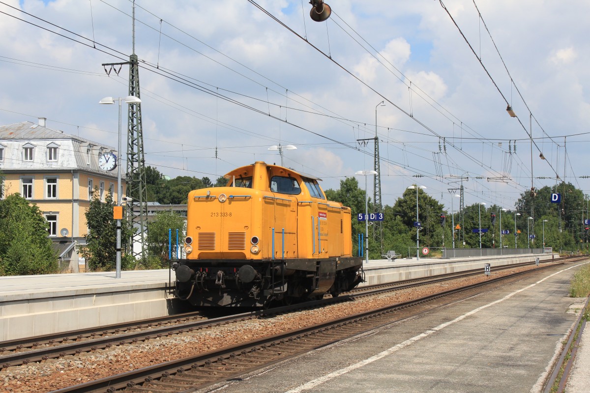 212 306 der "Bahnbau-Gruppe" war am 6. April 2021 mit drei Schüttgutwagen bei Übersee am Chiemsee in Richtung Freilassing unterwegs.