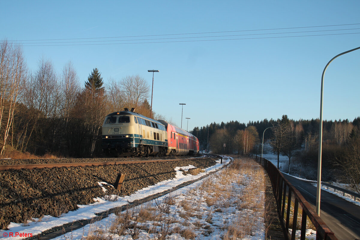 218 438-0 zieht kurz vor Wiesau/Oberpfalz den RE2 RE4852 München - Hof.