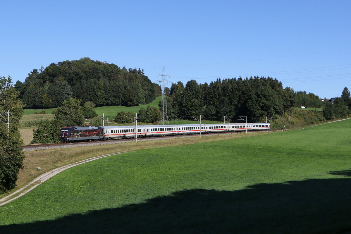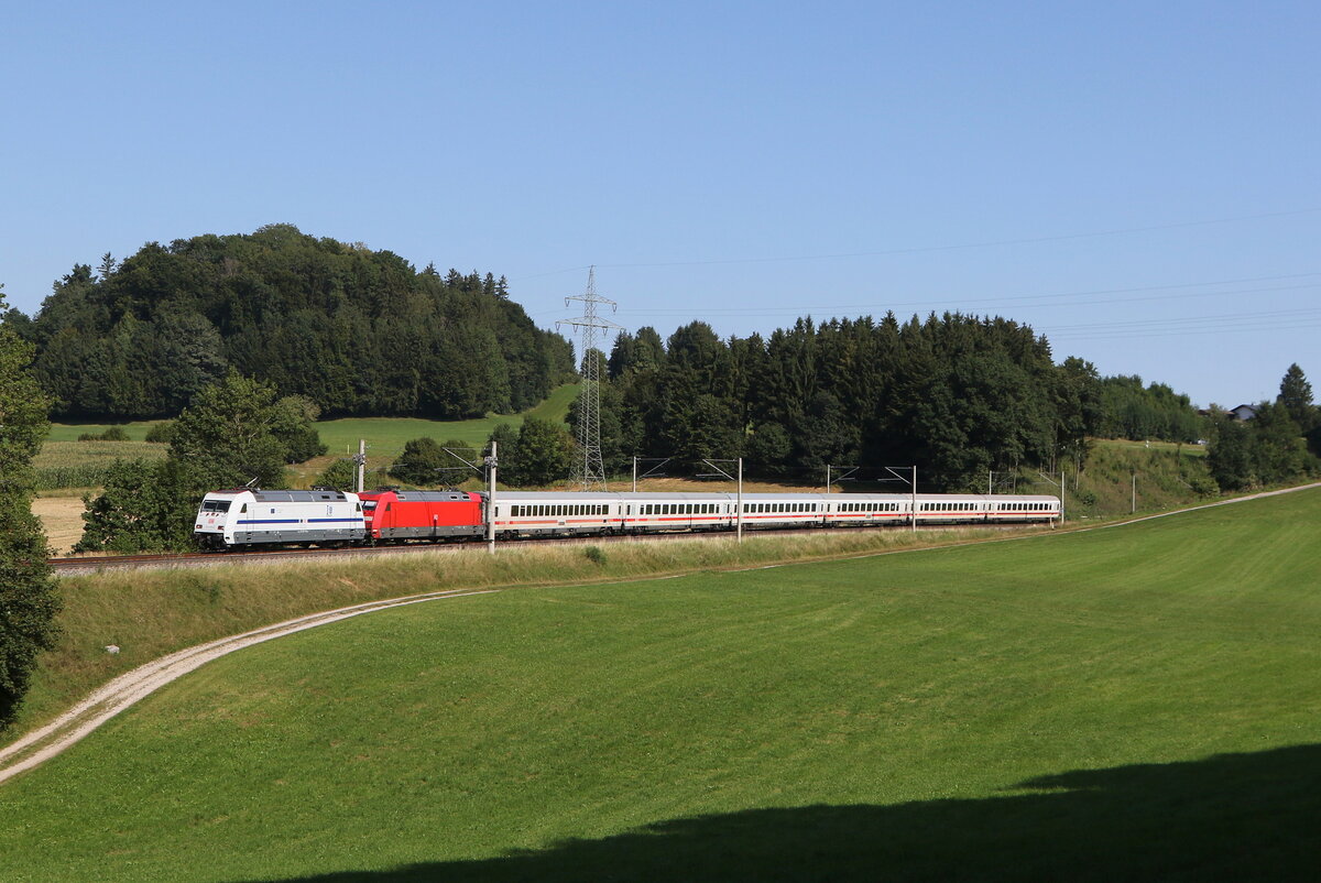 101 060-2 war am nächsten Tag ziehend in Richtung Salzburg im Einsatz. Aufgenommen am 23. August 2015 bei Weisham.