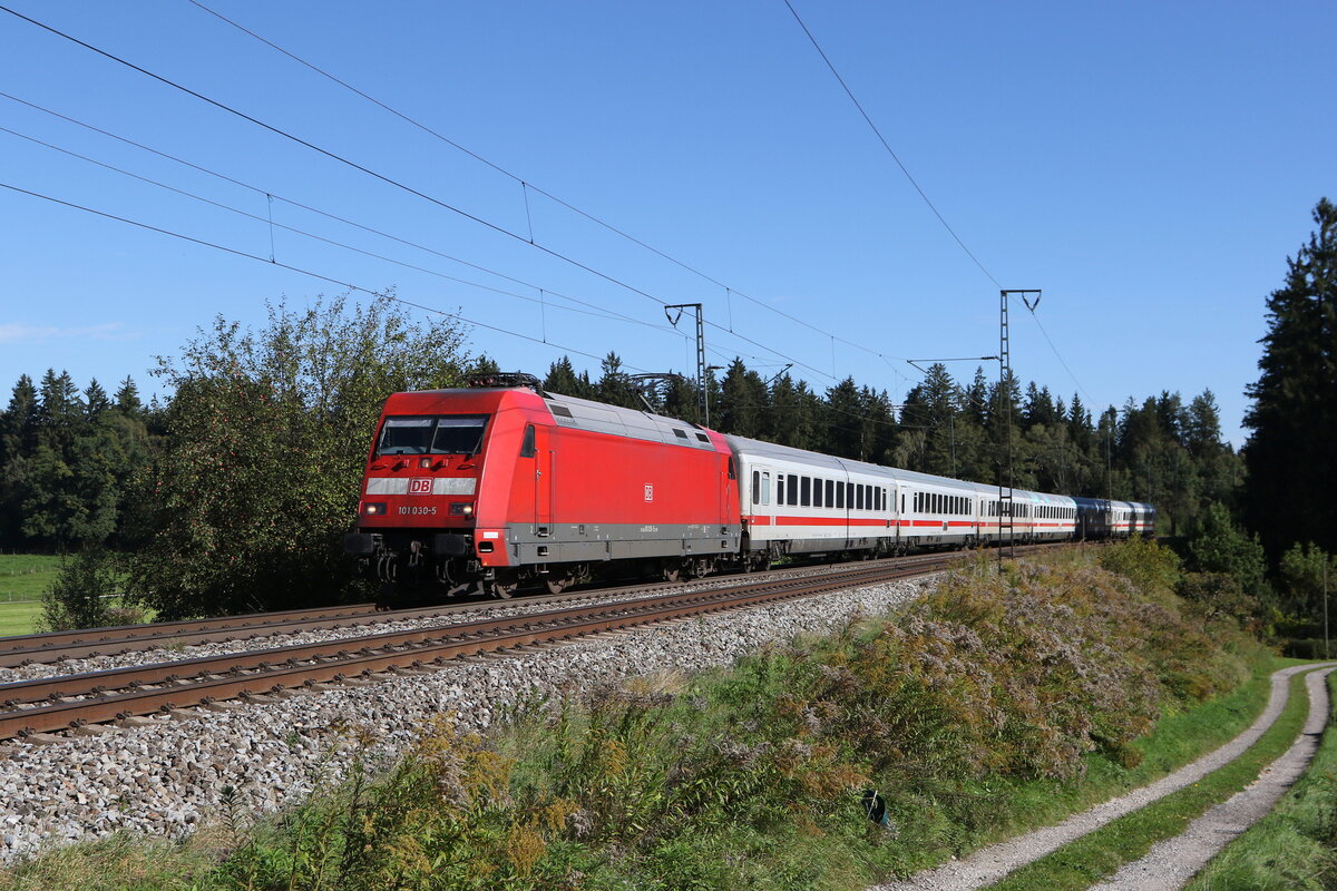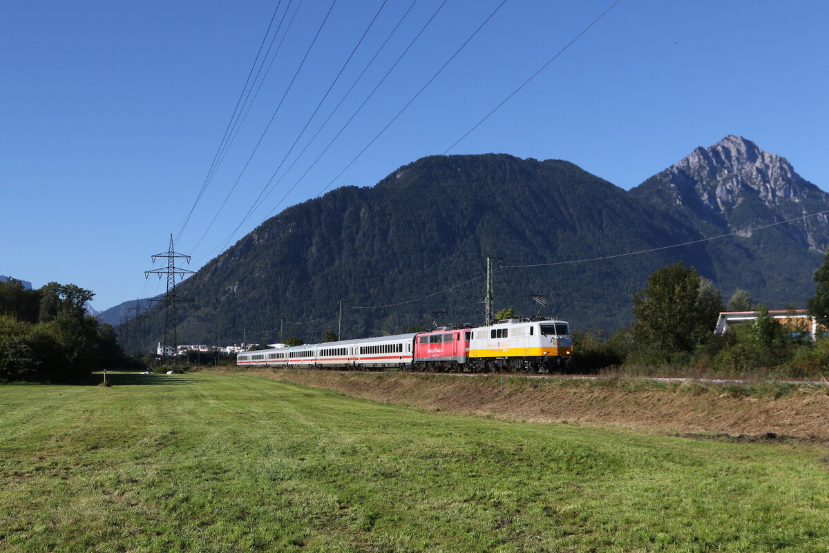 1011 057 und 101 069 waren am 19. August 2025 mit dem "IC Königssee" bei Vachendorf im Chiemgau in Richtung München unterwegs.