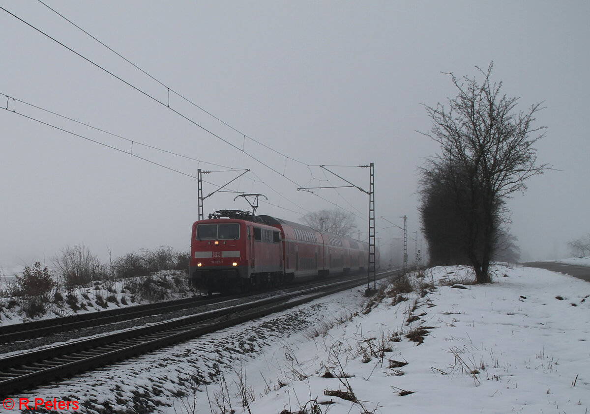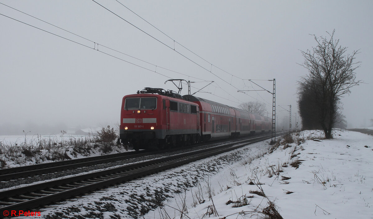 111 187-1 zieht bei Pölling den RE50 München - Regensburg - Nürnberg. 09.12.23