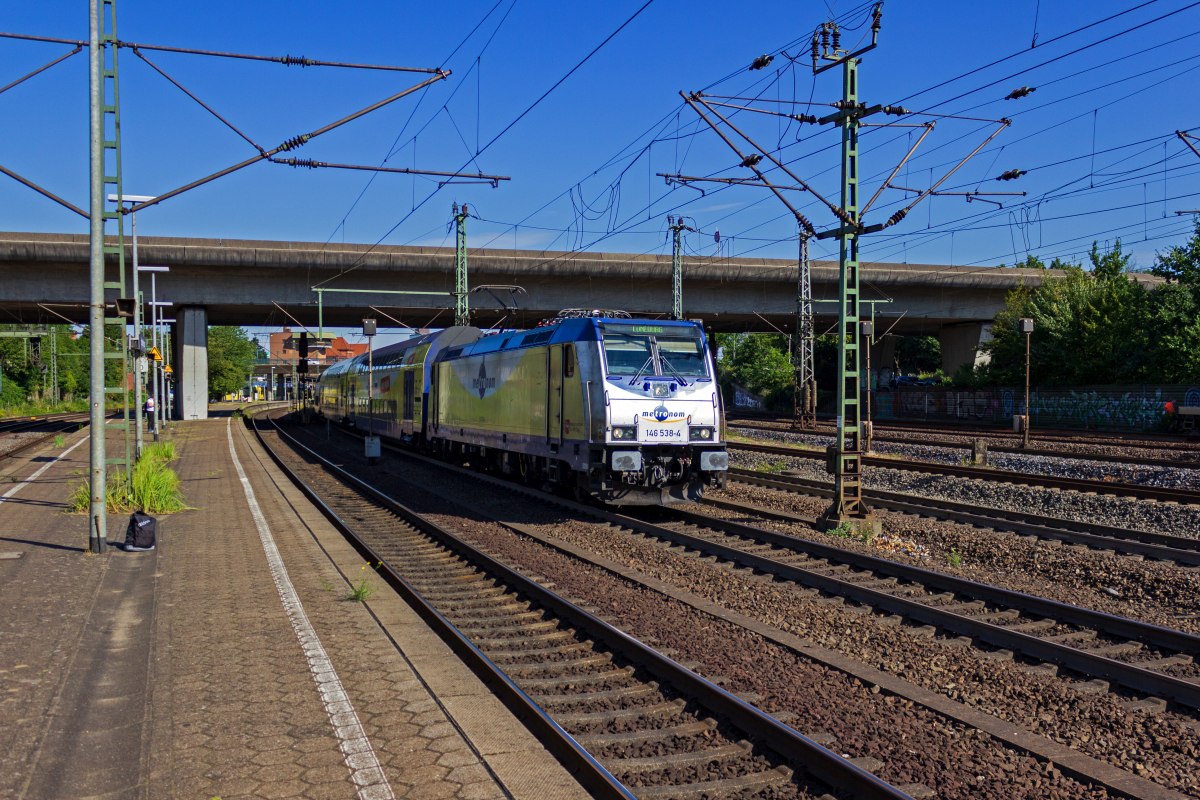 Mit einem RE3 nach Uelzen unterquert 146 531 am 05.08.2020 die Brücke der in Harburg als Autobahnzubringer dienenden B75.