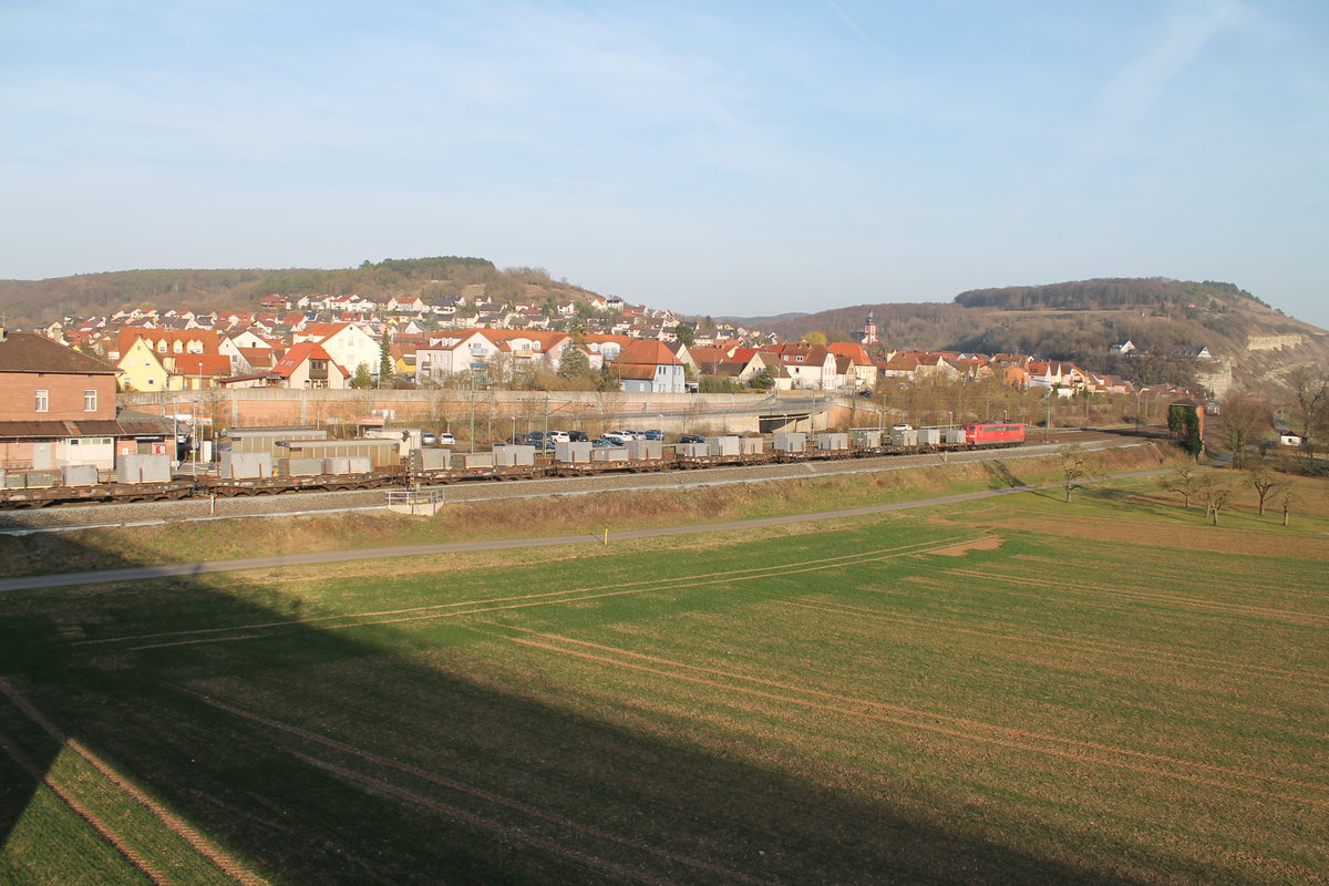 151 150-0 zieht ein Gemischten Güterzug mit Granitblöcken und Stahlbansen durch Retzbach-Zellingen. 16.03.17