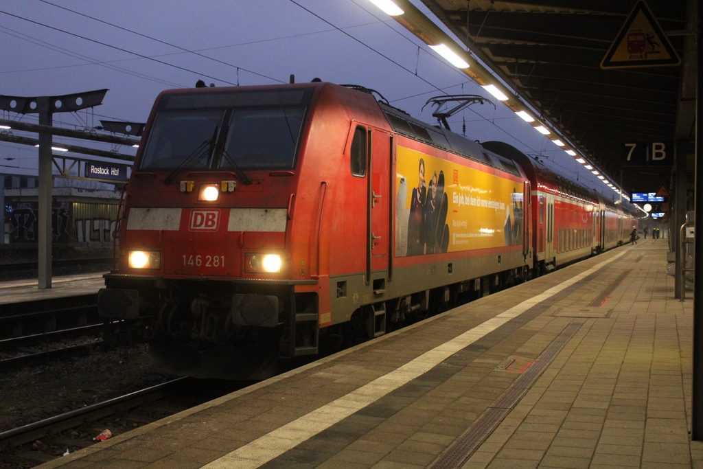 146 281 mit RE 4310(Rostock-Hamburg)kurz vor der Ausfahrt am 02.07.2021 im Rostocker Hbf.