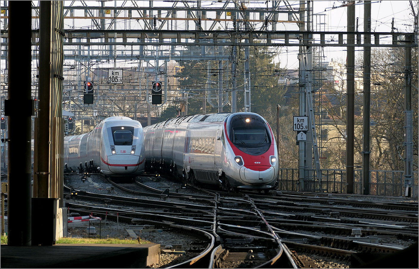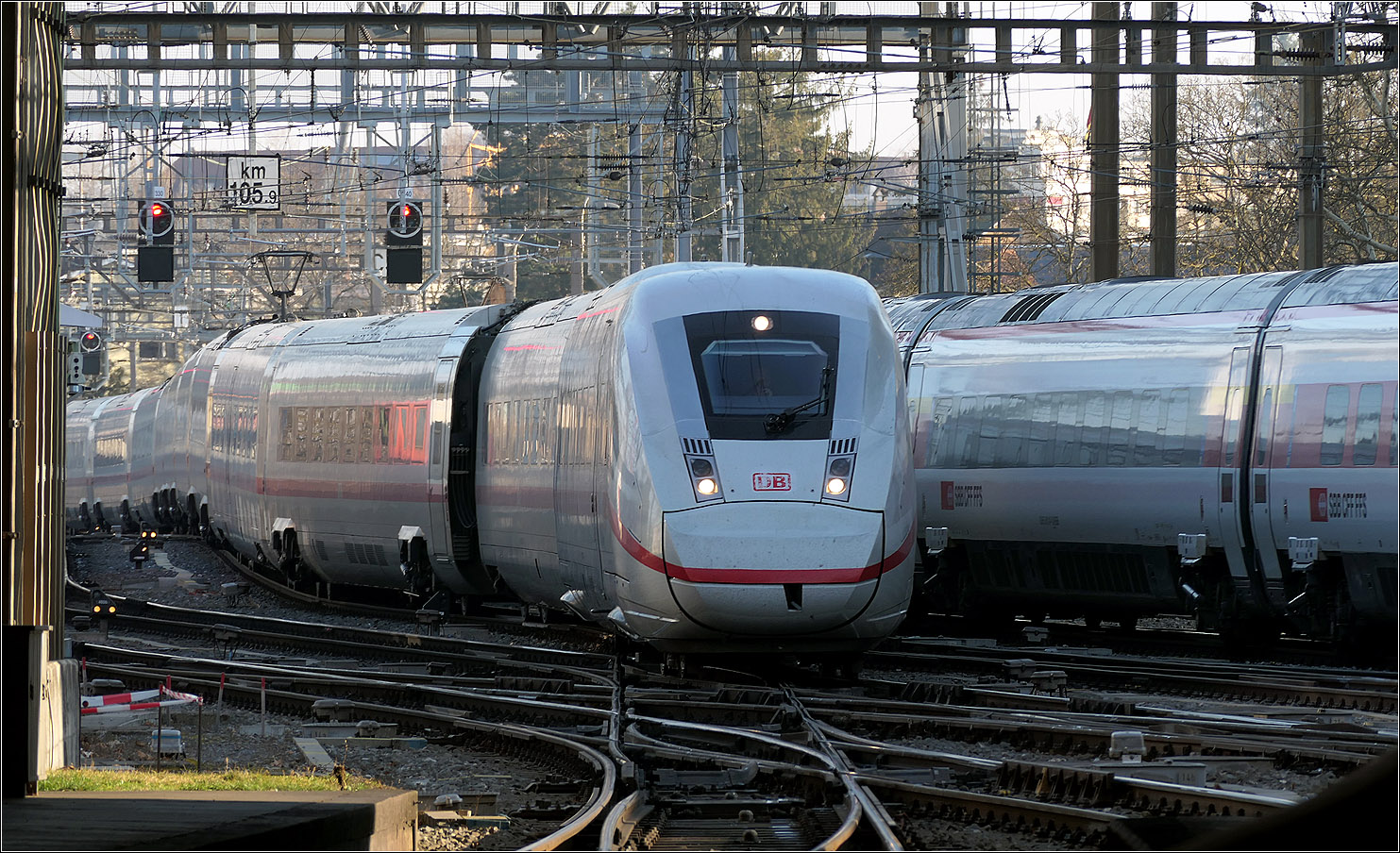 ICE Zürich – Stuttgart kommt aus Schaffhausen, wo er für einige Kilometer die Hochrheinstrecke der badischen Hauptbahn befährt. Februar 2010.