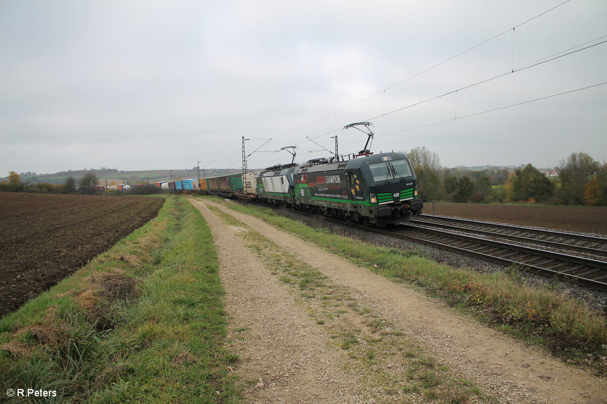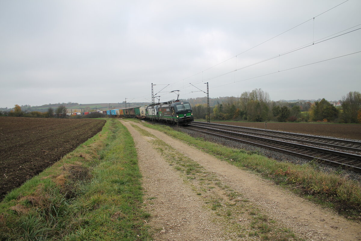 ES64 F4 093 zieht ein Wechselpritschenzug bei Retzbach-Zellingen gen Norden. 13.10.18