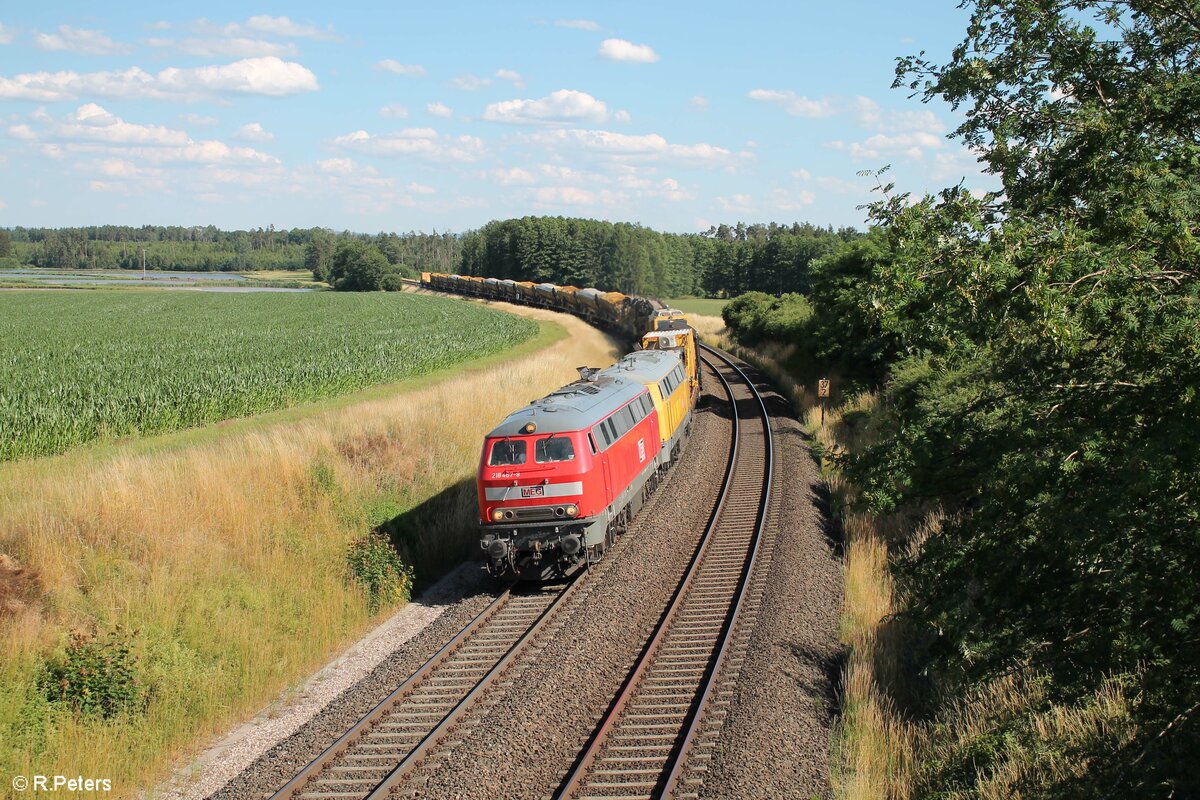 MEG 218 467 unmd 218 391 BahnBau mit einem langen Bauzug aus Mühldorf nach Hof bei Oberteich. 03.07.22
