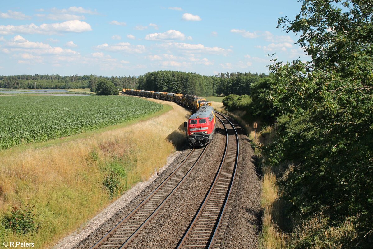 MEG 218 467 unmd 218 391 BahnBau mit einem langen Bauzug aus Mühldorf nach Hof bei Oberteich. 03.07.22