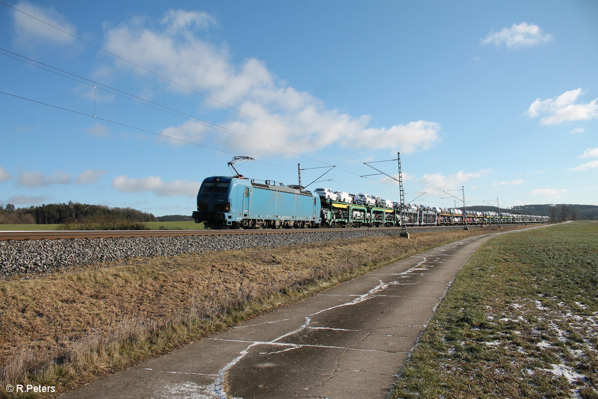 192 047 zieht ein Autotransportzug bei Oberdachstetten in Richtung Würzburg. 12.01.25