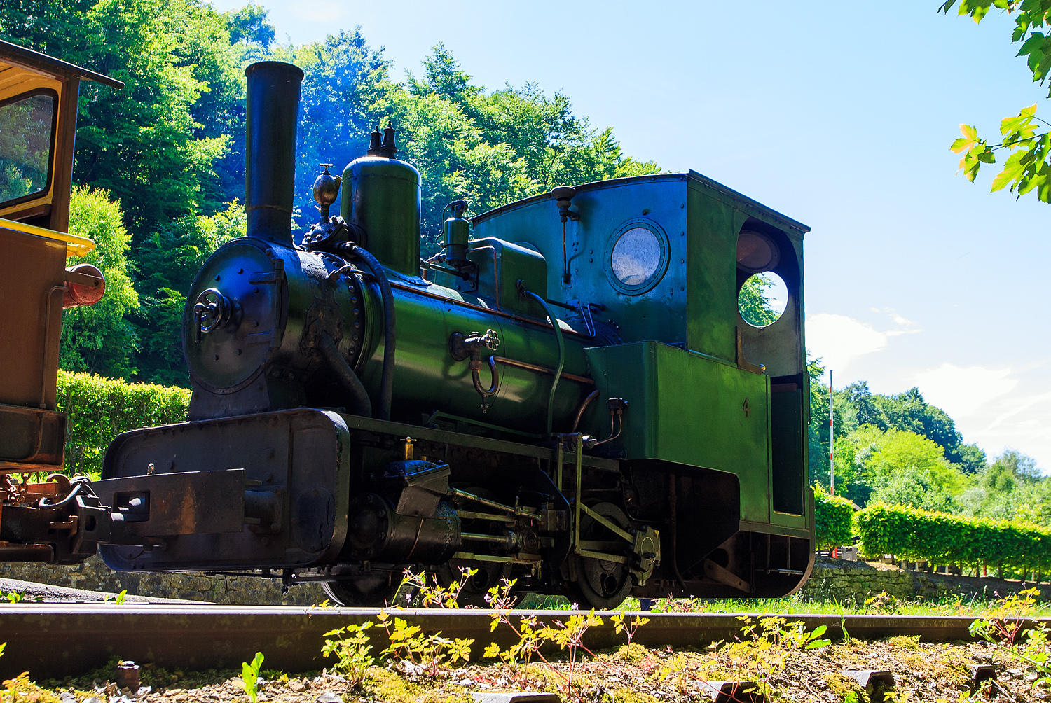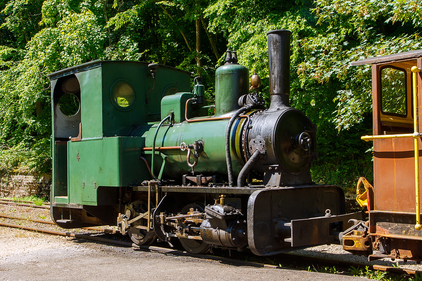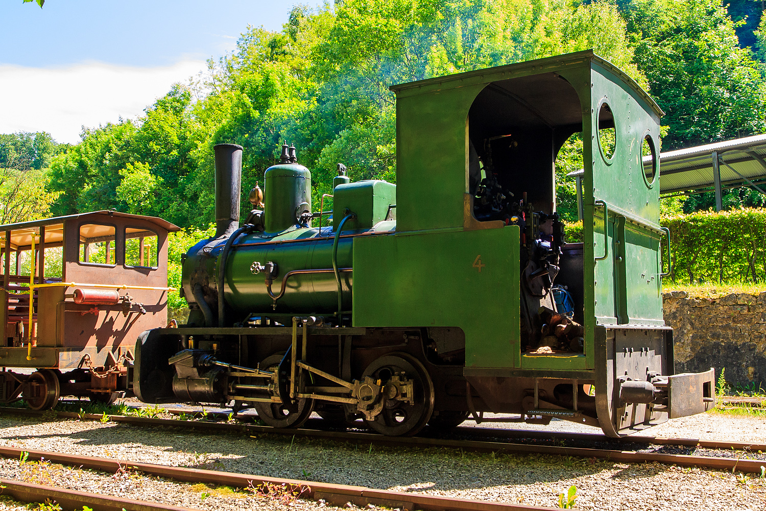 Die älteste erhaltene luxemburgische Dampflok, die 700 mm Schmalspur Dampflok Krauss 4 der Grubenbahn Minièresbunn Doihl hat am 16 Juni 2013 mit ihrem Personenzug von Doihl kommend den Industrie- und Eisenbahnpark Fond-de-Gras erreicht.