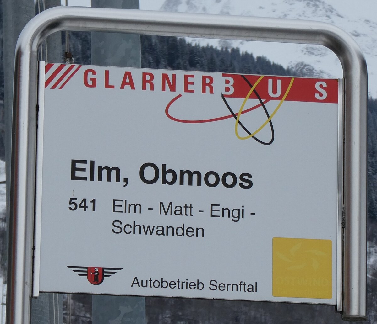 (284'449) - GLARNER BUS/Autobetrieb Sernftal-Haltestellenschild - Elm, Obmoos - am 30. Januar 2026