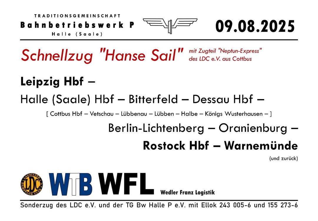 Am 09.08.2025 geht es mit dem Schnellzug "Hanse-Sail "Von Leipzig Hbf nach Warnemünde zur Hanse-Sail zurück,inklusive Stadttour in Berlin Stefan Pavel