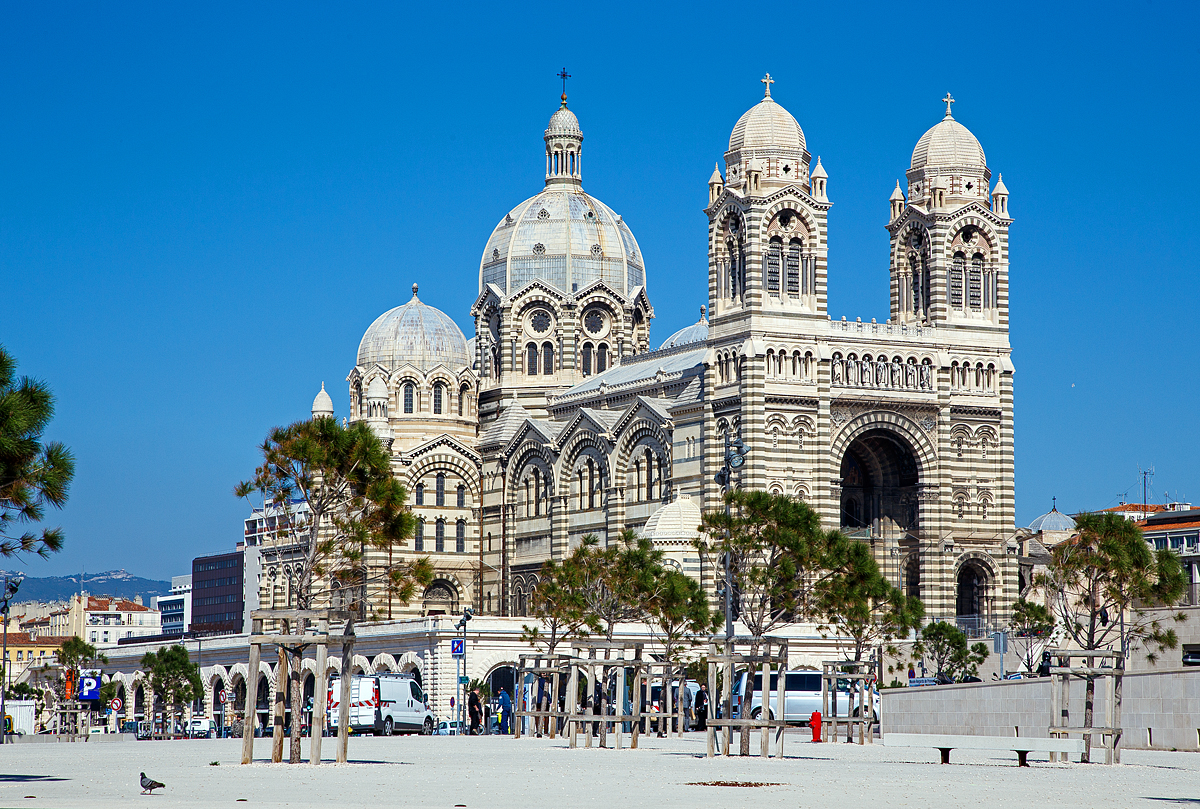 Mit der Henri-Jacques Espérandieu eine der Touristen-Fähren geht es am 25.03.2015 vom alten Hafen Marseille (le Vieux-Port de Marseille) zu den Frioul Inseln (u.a. zur Île d’If mit dem Chateau d' If). Hier hatte ich vom Heck des Schiffes (Achterdeck) den Blick auf Marien-Wallfahrtskirche Notre-Dame de la Garde.
