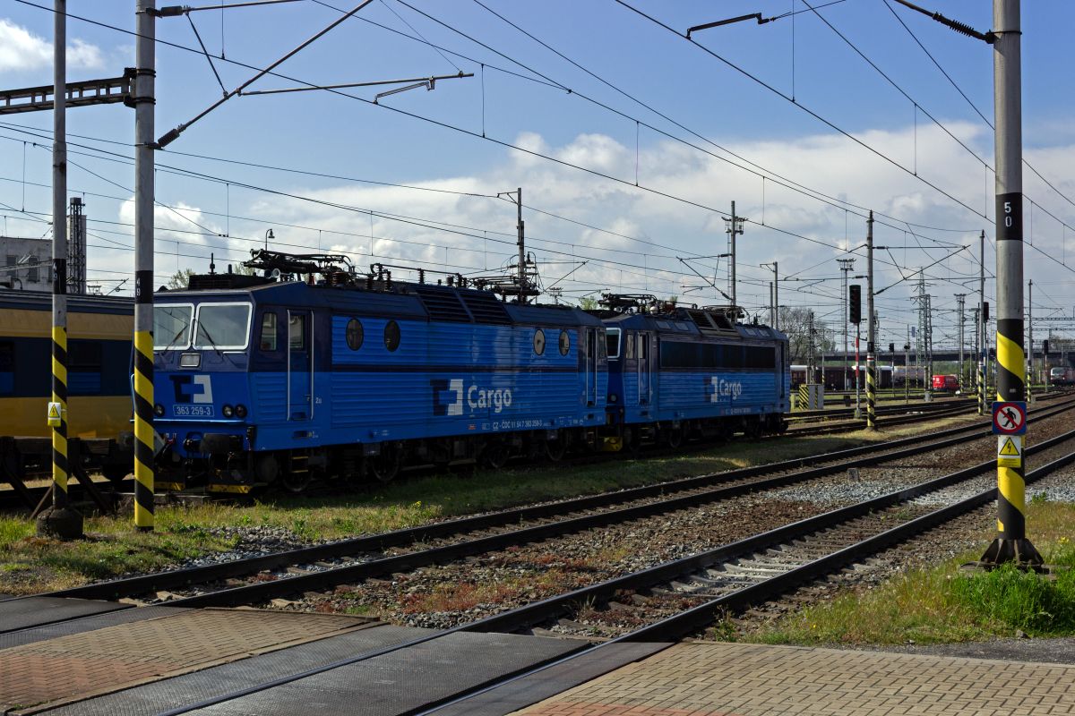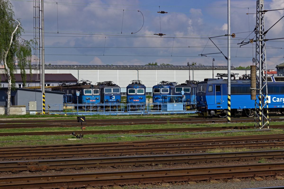 Zwei Generationen von Güterzuglokomotiven waren am 23.04.24 im Bahnhofsbereich Praha-Libeň abgestellt: 363 518 von ČD Cargo als Vertreterin der klassischen ¦koda-Lokomotiven neben dem modernen Vectron 383 065 des privaten Unternehmens EP Cargo.