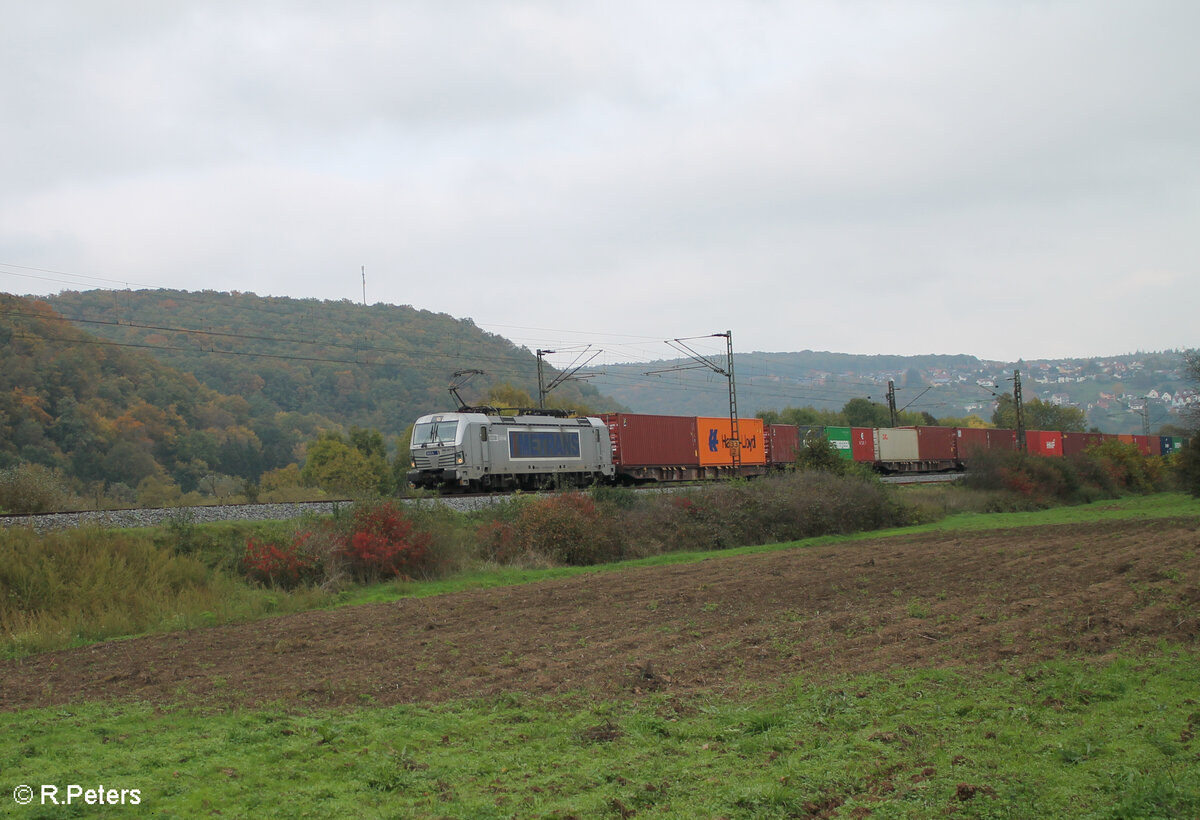187 511-1 zieht mit einem Containerzug bei Retzbach-Zellingen in Richtung Süden. 21.10.24