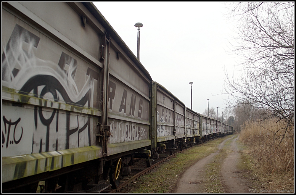 Im Rangierbahnhof stehen viele Güterwagen seit Jahren abgestellt. Diese Schiebewandwagen besitzen sogar keine Landes- und Halterkennung mehr (gesehen Brandenburg Hbf 19.02.2011, Fotostandort öffentlich zugänglich)