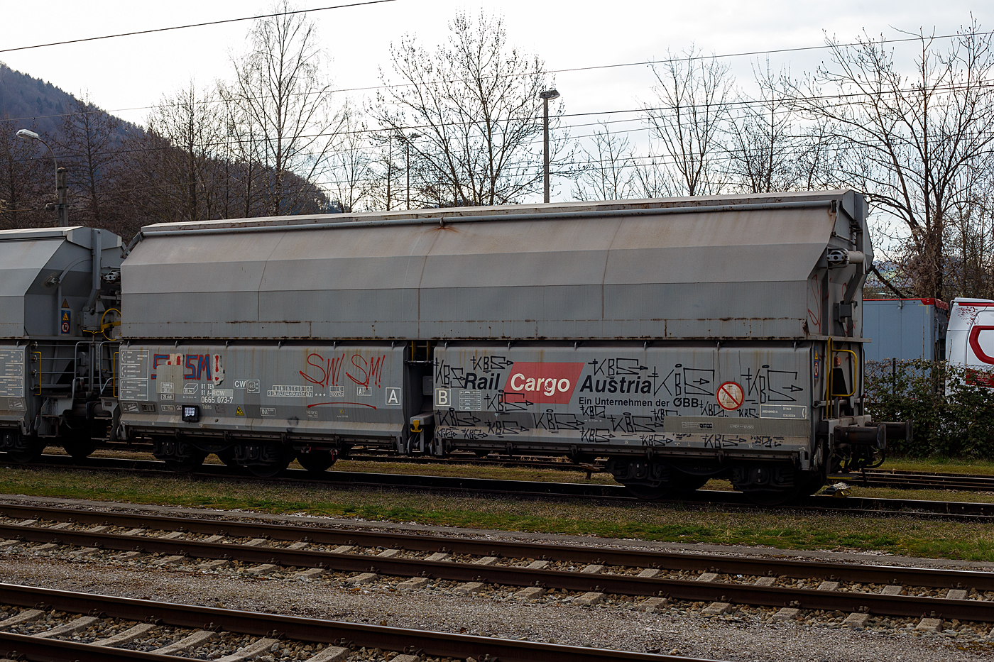 Vierachsiger gedeckter Schüttgutwagen mit Schwerkraftentladung, pneumatischem/mechanischen Klappenverschlusssystem und öffnungsfähigem Dach, 81 81 0665 217-0 A-RCW, der Gattung Talns, der Rail Cargo Austria, abgestellt am 02 April 2025 beim Bahnhof Gmunden bzw. beim Zementwerk Hatschek in Gmunden der Rohrdorfer Zement GmbH.
