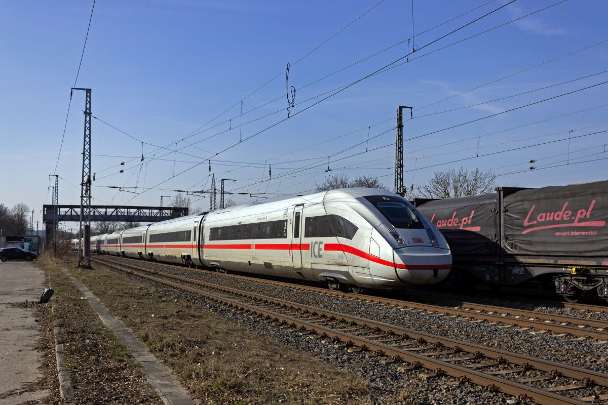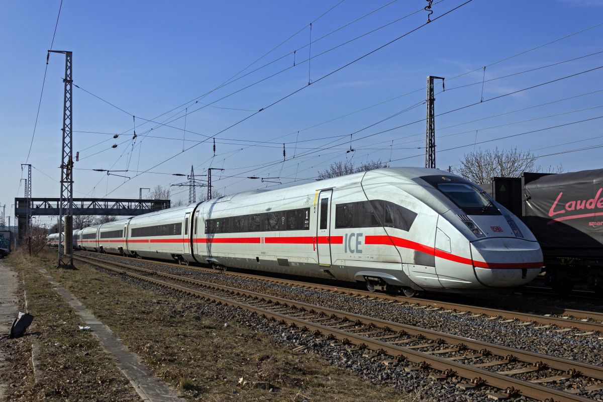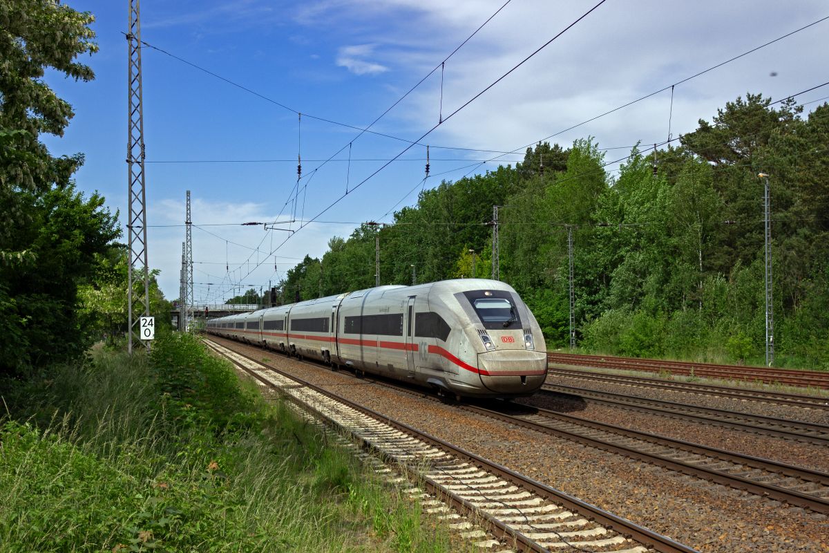 Der 13-teilige ICE4-Triebzug 9493 rauscht am 21.05.2025 südwärts durch Ludwigsfelde.