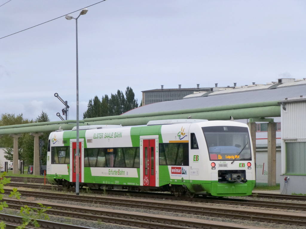 VT 306 der EB wartet vor der Werkstatt auf ein Signal zur Ausfahrt, laut Beschilderung wird er im Anschluss nach Leipzig fahren, 1.9.15. Alanya Du Rouen