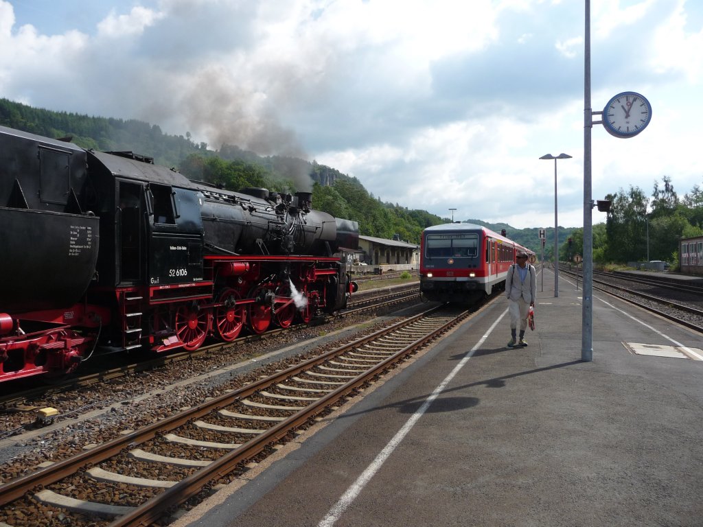 V100 2299 gehört der Vulkaneifelbahn (VEB), die sie in ihre ursprünglichen Lackierung zurückversetzt hat. Am 7.8.2013 scheibt die Lok einen leeren Schotterzug durch den Bahnhof von Gerolstein. Alanya Du Rouen