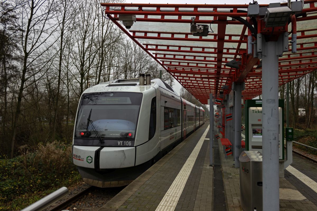 S28 nach Kaarster See bei der Durchfahrt in Sonnborn. Anfang 2021 hatte noch nicht alle der von der BOB gekauften Integrale ihre bayrischfarbige Lackierung verloren, so auch hier der VT 109 am 8.2.2021.