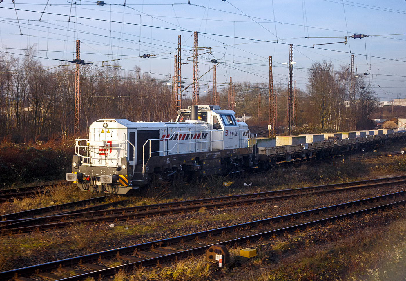 Die 4185 142-1 (92 80 4185 142-1 D-ERD) eine dieselelektrische Vossloh DE 18 der Eiffage Infra-Rail GmbH schient einen Bauzug am 21 Januar 2025 in den Abstellbereich (Schieneninfrastruktur) der Eiffage Infra-Rail GmbH in Herne (ehemals Heitkamp Rail GmbH). Bild aus einem IC heraus.
