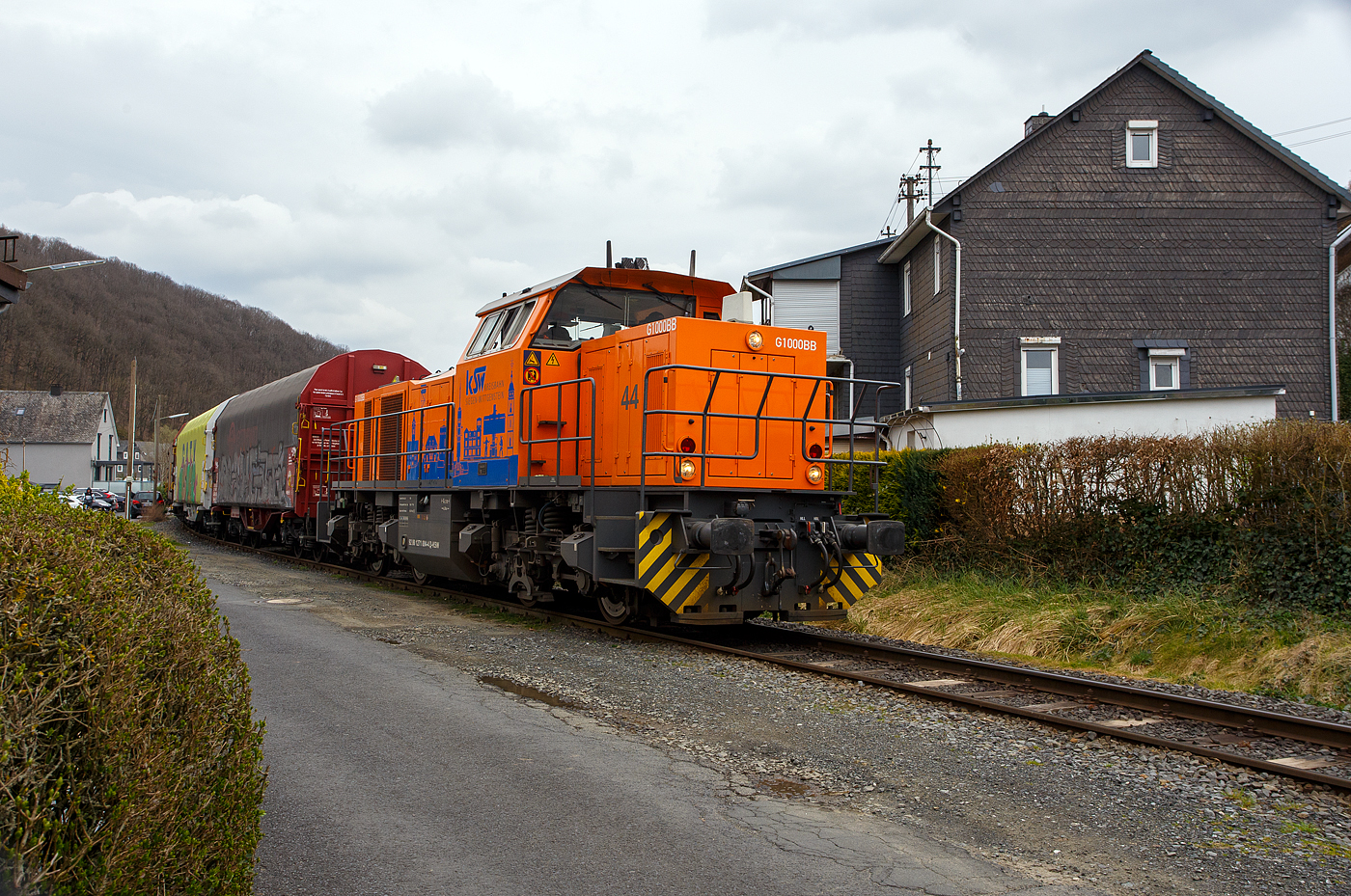 Nun drückt die 271 022-6 „Charlotte“ (92 80 1271 022-6 D-KAF) eine Vossloh/MaK G 1000 BB der KAF Falkenhahn Bau AG. ex MRCE bzw. ex HGK DH 49, am 26 August 2025 den mit Aushub beladenen Niederbordwagen-Zug (zweiachsiger Flachwagen NS Gattung Klmos 702 der Vermietungsfirma Railpro), von der Baustelle im Bf Scheuerfeld/Sieg ca. 3 km nach Betzdorf/Sieg. Beim Rbf Betzdorf befindet sich die Umladestation, hier wird der Aushub von Baggern abgeladen und zwischengelagert.