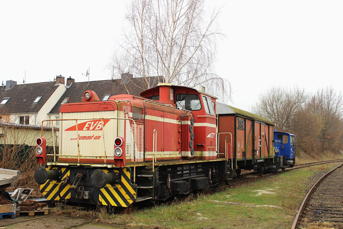 25 Jahre Moorexpress: Fahrzeugausstellung mit EVB 274, EVB 211 323-1, 169 001 (219 001-5) und die 335 212-7 für Führestandsmitfahrten. Gnarrenburg, 10.05.2025.