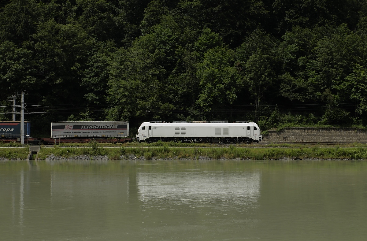 An den Oberleitungsmasten erkennt man, dass die Stadler-Eurodual-Lok 159 207-0 vom vorherigen Bild auf ihrer Fahrt von Kufstein in Richtung Norden inzwischen die Grenze passiert hat (Kiefersfelden 17.07.2020)