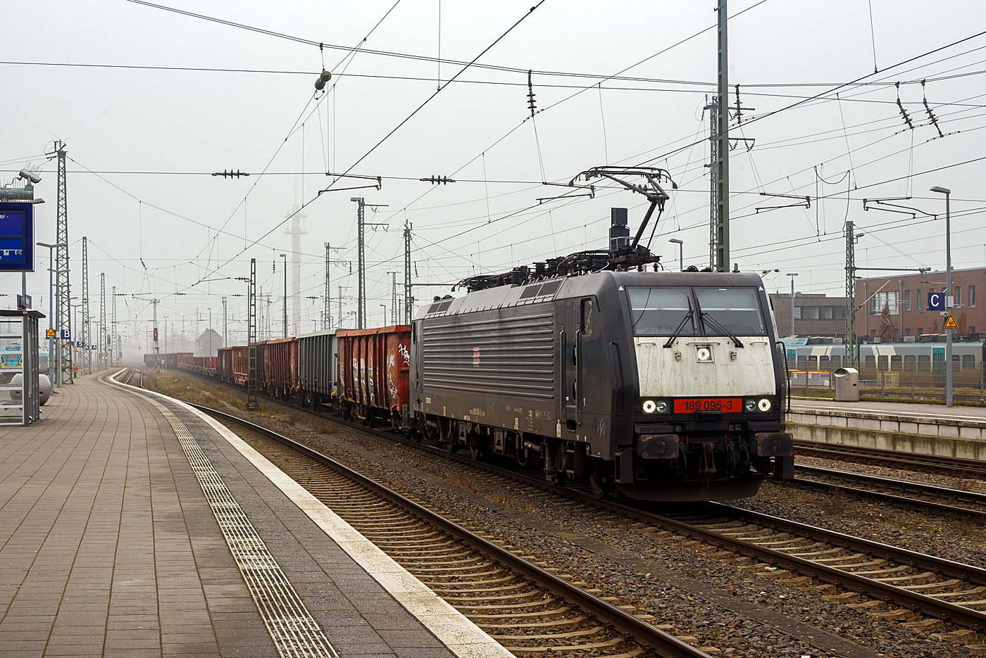 Die schwarze DB 189 095-3 (91 80 6189 095-3 D-DB) der DB Cargo AG, ex MRCE Dispolok E 189-095-3 / ES 64 F4-995, am 21 Januar 2025 mit einem gemischten Güterzug im Bahnhof Rheine. Länger hatte sie Hp 0 nun endlich hat sie Hp 1 und fährt Richtung Norden los.