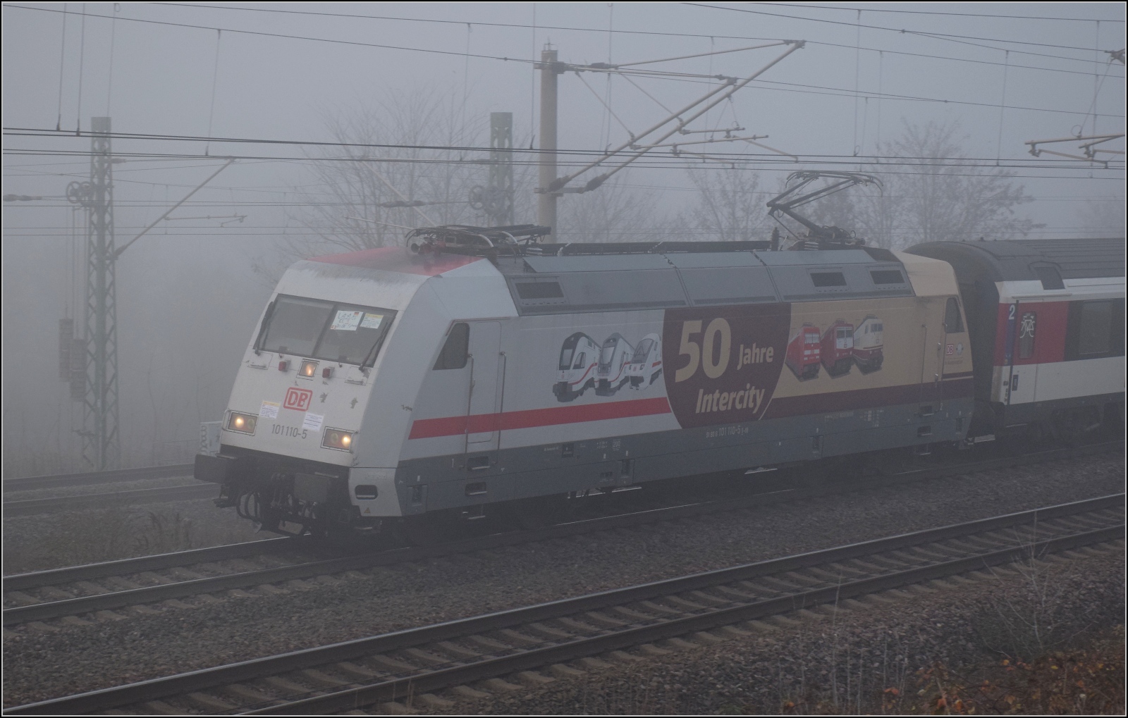 Ende einer Ära. 101 110 mit dem allerletzten EC nach Basel, dem EC 9. Ab dem Fahrplanwechsel fährt kein Eurocityzug mehr in die Schweiz. Schliengen, Dezember 2025.