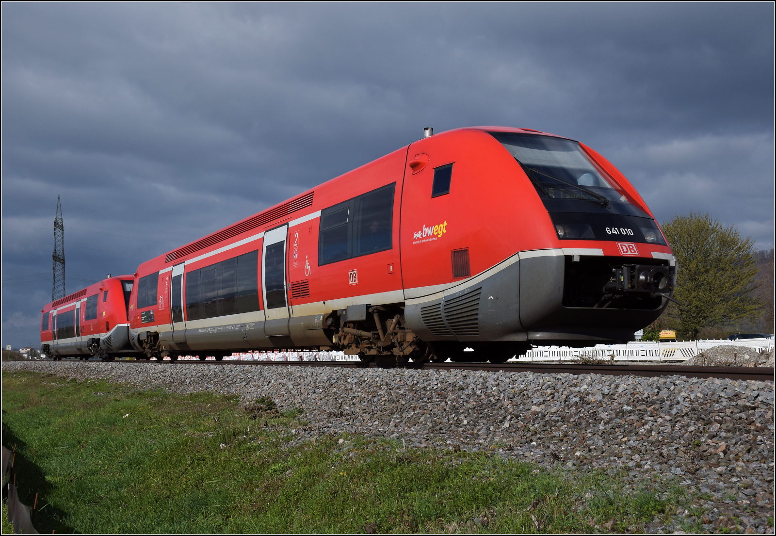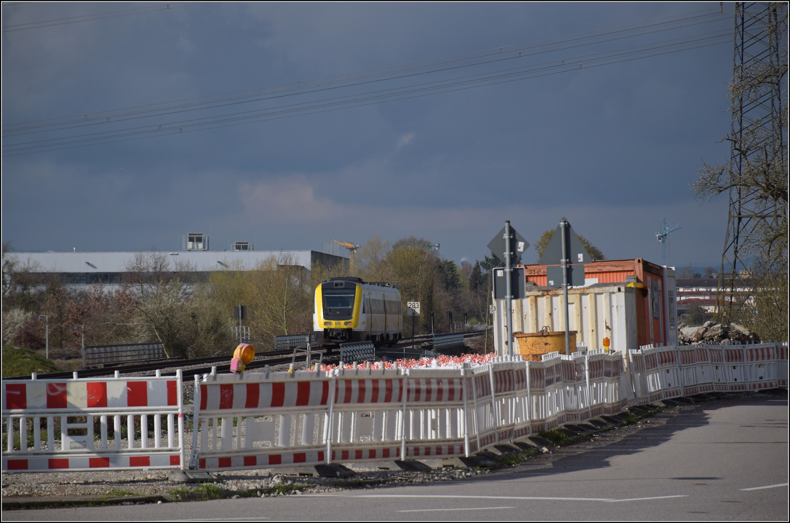 Hier ist eine Bahn der S65 der S-Bahn Schaffhausen auf dem Weg nach Erzingen (Baden) unterwegs. Markant der Pylon der Schrägseilbrücke der A4 über den Rhein, der hier hochragt.