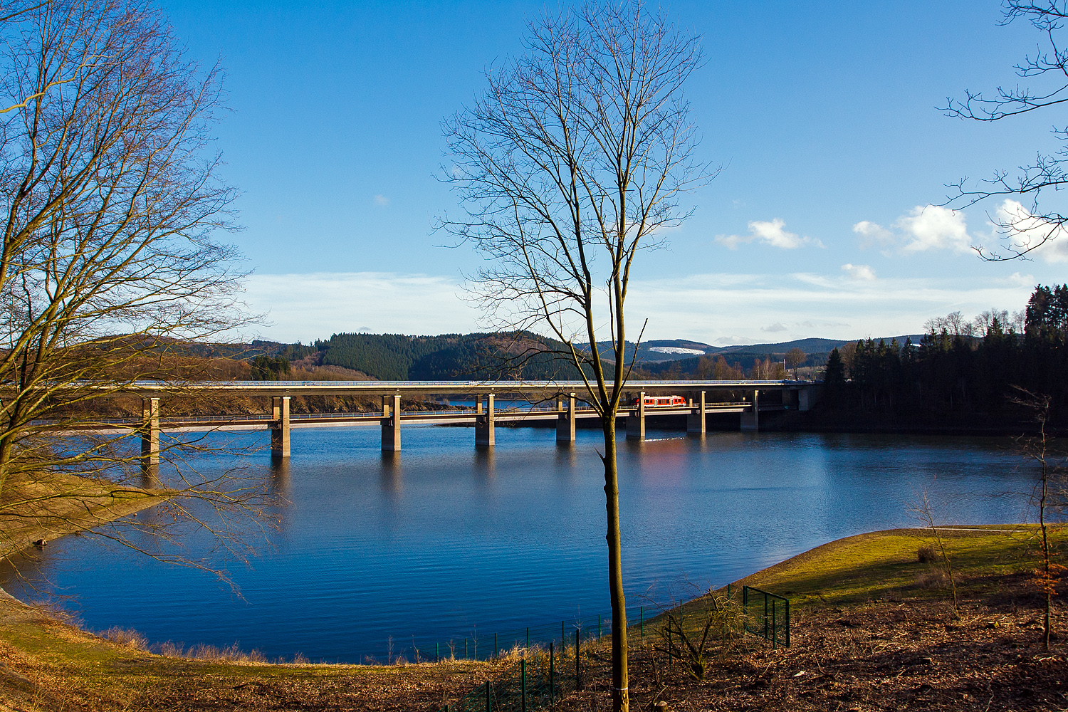 Ein LINT 27 der DreiLänderBahn (DB Redio NRW) überquert am 02 Februar 2014, als Regionalbahn RB 92 "Biggesee-Express" (Olpe – Finnentrop), den Biggesee auf der Doppelstockbrücke Listertal.
