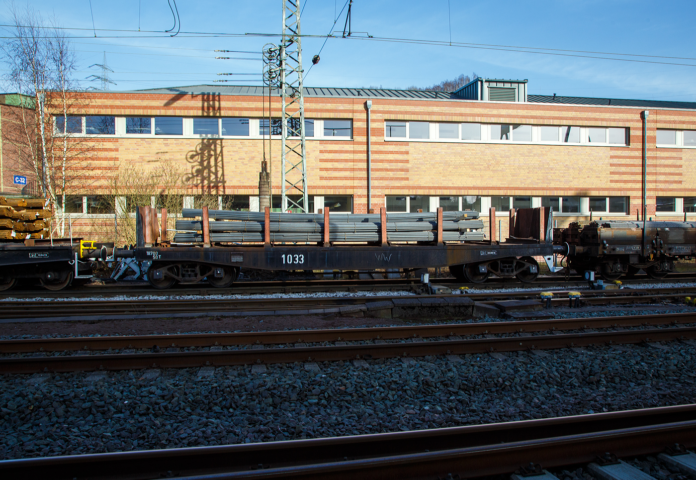 Vierachsiger Drehgestell-Flachwagen mit Drehrungen und Stirnwandklappen, jedoch ohne Seitenborde, 31 80 3961 943-8 D-DB, der Gattung Rmms 664, der DB Cargo AG, beladen mit Rundstahl, am 12. März 2017 im Zugverband auf dem Anschlussgleis der Deutschen Edelstahlwerke GmbH, zuvor Edelstahlwerke Südwestfalen, in Siegen-Geisweid