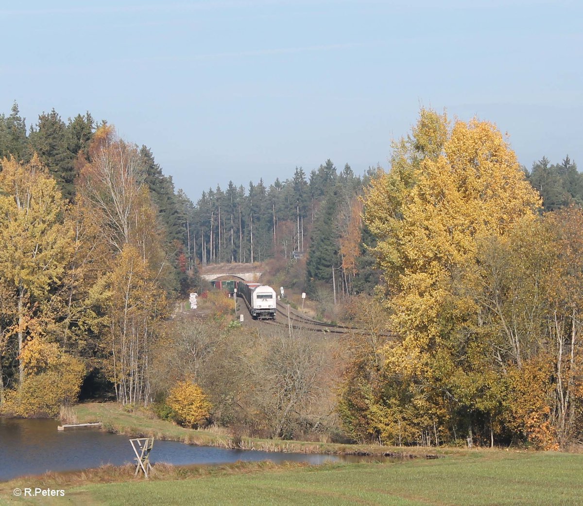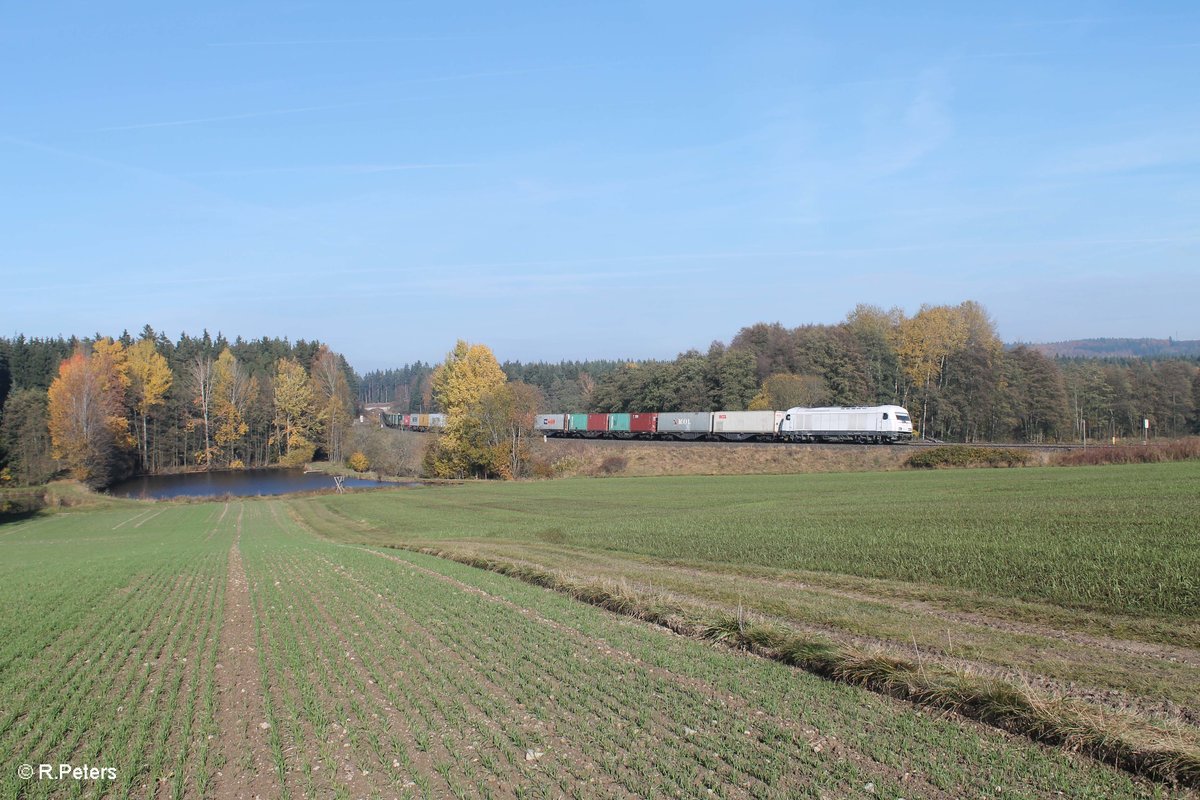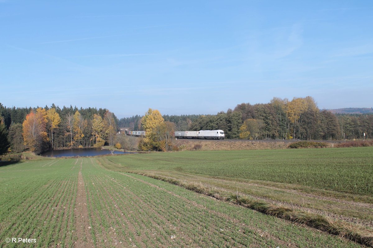 223 143 zieht den Wiesau Containerzug bei Oberteich. 01.11.16
