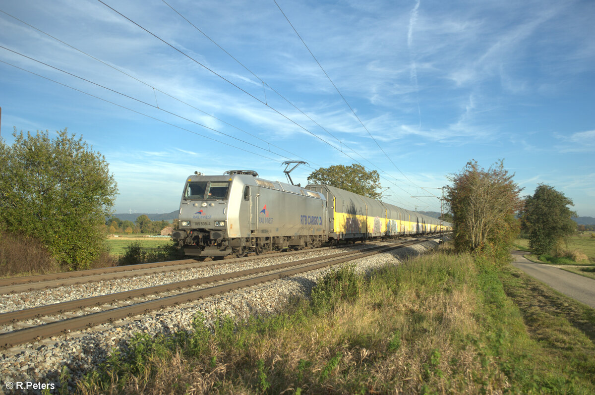 6193 999-0 "Györ" der RTB Cargo zieht mit einem offenen Autotransportzug bei Wernfeld in Richtung Norden. 20.10.24