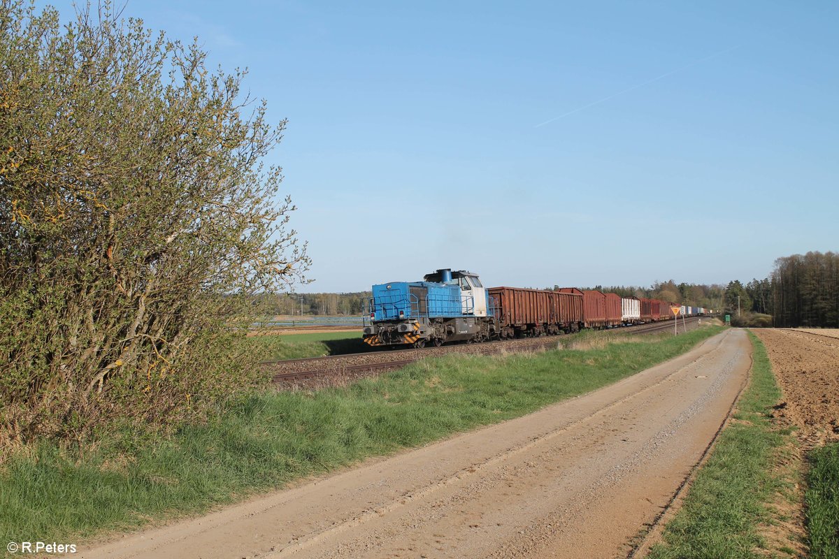 277 005 zieht den leeren Holzzug aus Wiesau/Oberpfalz nach Cheb/Eger bei Oberteich. 19.04.18