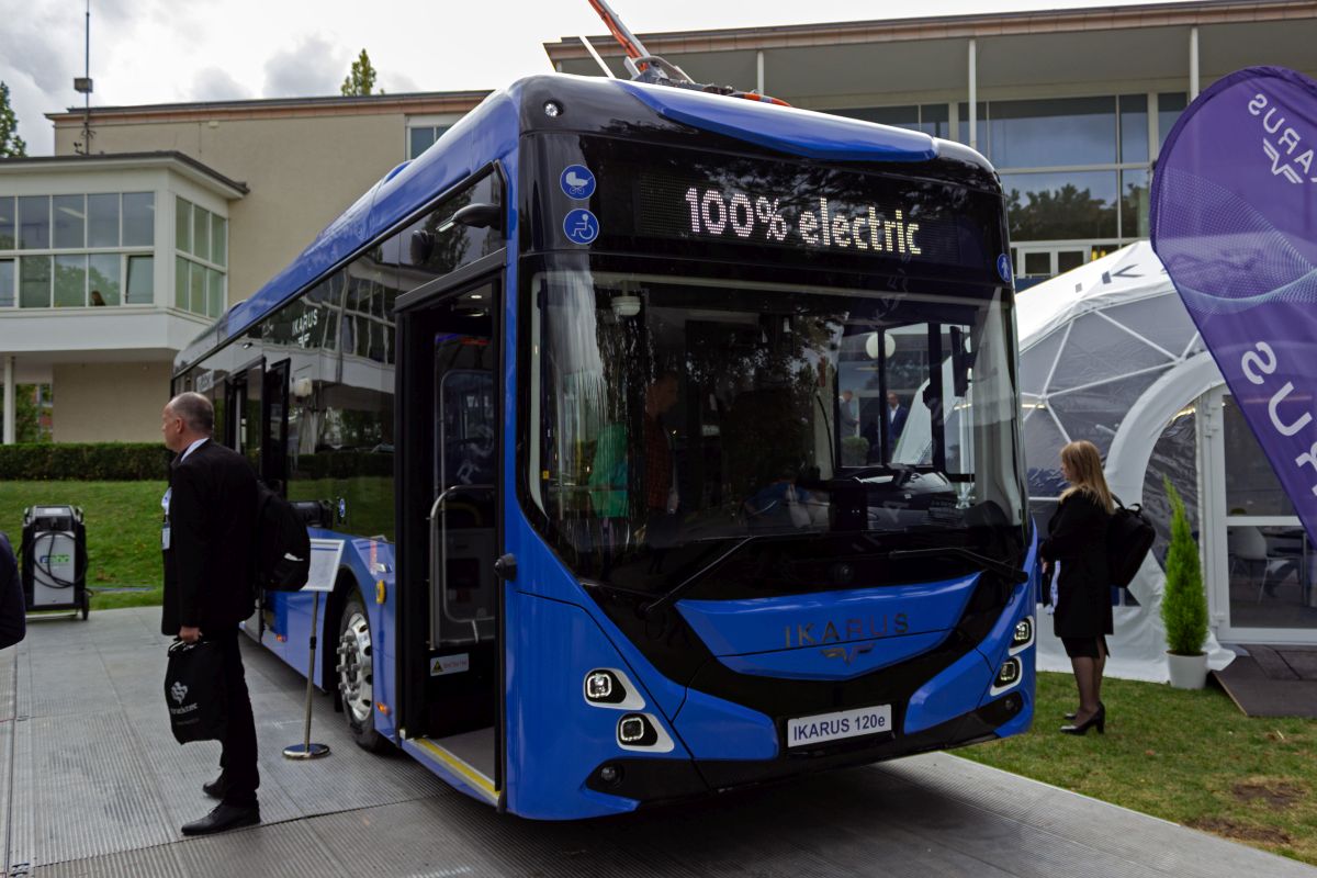 Ein elektrischer Midibus vom Typ 80e von Ikarus, der auf der InnoTrans im Sommergarten zu sehen war.