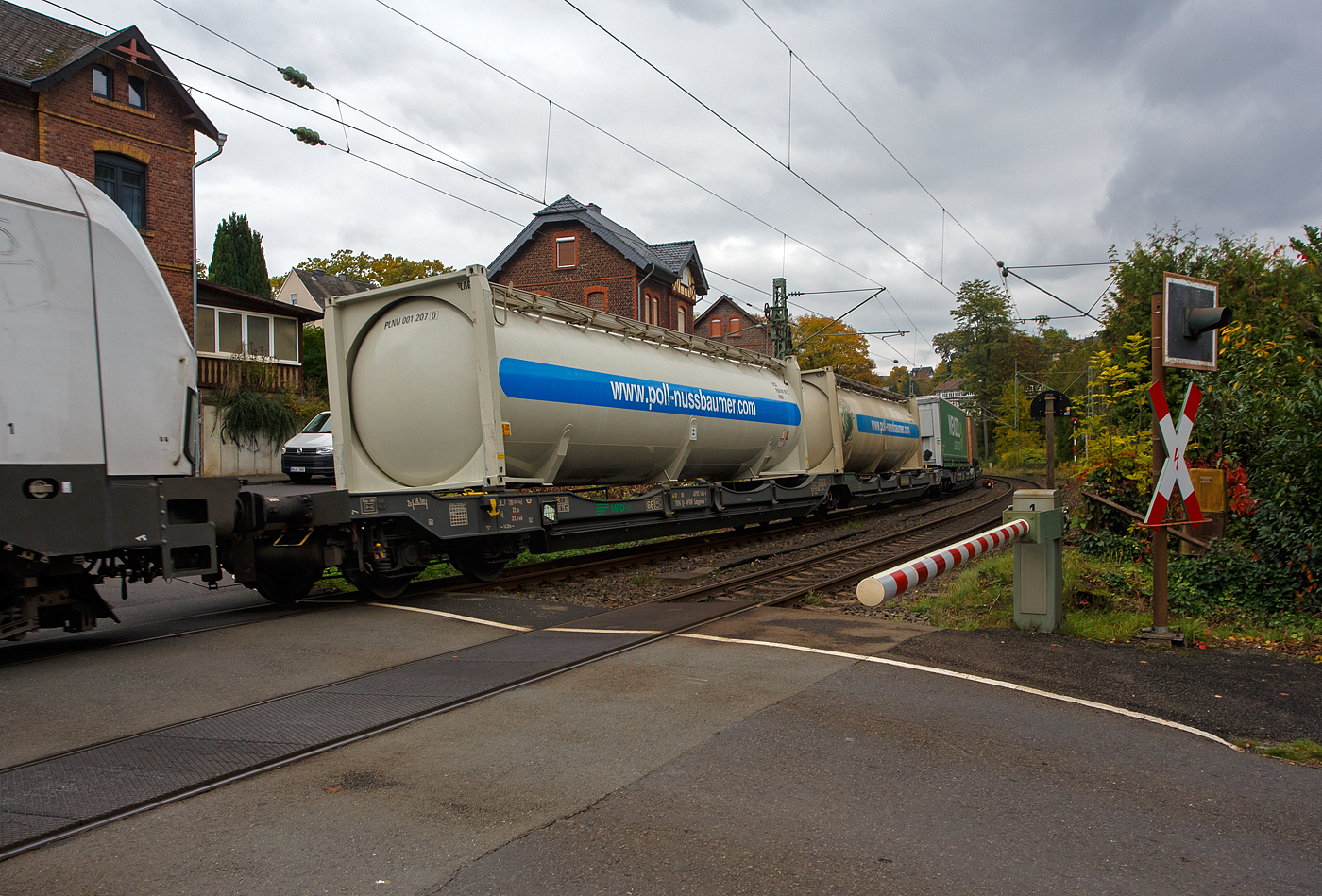 Fix gekoppelter 8-achsiger (2 x 4-achsiger) Drehgestell-Containertragwagen, 37 80 4657 334-1 D-RCW, der Gattung Sggmrrs-y M23 (2x60`), der MFD Rail GmbH (Rotkreuz/CH), viermietet an die Rail Cargo Group, eingestellt in Deutschland, am 12 April 2025 im Zugverband bei der Durchfahrt in Rudersdorf (Kr. Siegen). Hier beladen mit 4 Stück. Mit einer Nutzlast von 28.900 kg können mit dem 30 Fuß MOBILER-Halftainer verschiedene Schüttgüter wie etwa Altglas, Schlacke oder Industriesalz effizient transportiert werden, auf einem LKW dienen sie zugleich als Kippmulde.