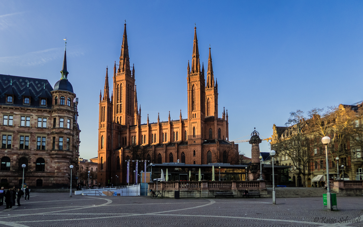 Die Wiesbadener Marktkirche am Schlossplatz ist ein Backsteinbau der Neogotik, erbaut zwischen 1853 und 1862 von dem Architekten Carl Boos. Sie diente im damaligen Herzogtum Nassau als dessen Landesdom. Mit ihrem 98 Meter hohen Westturm ist die Kirche das höchste Gebäude Wiesbadens. Als Vorbild diente seinerzeit die Berliner Friedrichswerdersche Kirche von Karl Friedrich Schinkel. (24.03.2018)